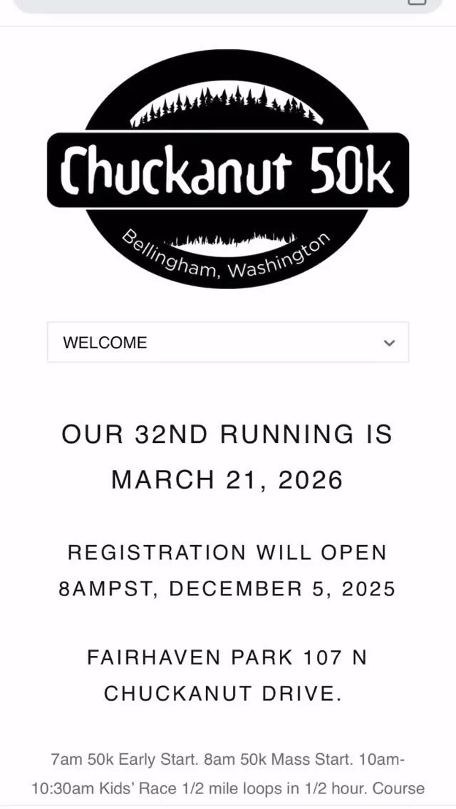 The Chuckanut 50k has been a project and love of mine for 20+ years. Registration Opens the first Friday in December. The race is always the 3rd weekend in March. If you would like to learn more about this event please see the official race website. www.chuckanut50krace.com